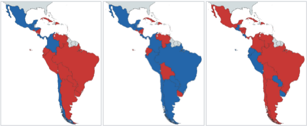 Political Ideology of Latin American executive leaders in 2011, 2018, and 2023 mapped: